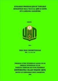 XMLErsa Dian Choirotunisak, 2023, Pengaruh Progam Qira’at Terhadap Kemampuan Baca Tulis Al-Qur’an Siswa MTs Labbaika Samarinda. Skripsi, Progam Studi Pendidikan Agama Islam, Jurusan Pendidikan Islam, Fakultas Tarbiyah Dan Ilmu Keguruan, Universitas Islam Negeri Sultan Aji Muhammad Idris Samarinda. Penelitian ini dibimbing oleh Bapak Prof. Dr. Muhammad Nasir, M.Ag. sebagai pembimbing I dan Ibu Rumainur, M.Pd.I sebagai pembimbing II.