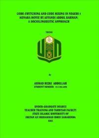 XMLAhmad Rizki Abdillah, 2023. "Code-switching and Code-mixing in Negeri 5 Menara Movie By Affandi Abdul Rahman, A Sociolinguistic Approach. Thesis Department of English Language Education, Teacher Training and Faculty of Tarbiyah, Sultan Aji Muhammad Idris State Islamic University Samarinda. This research was supervised by Mrs. Dina Destari, SS, M.Pd as the first advisor and Mrs. Dra. Sitti Hadijah, M.Pd as the second adrvisor.