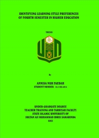 XMLAnnisa Nur Faedah, 2023. "Identifying Learning Style Preference of Fourth Semester Higher Education. Thesis, Department of English Education, Faculty of Tarbiyah and Teaching Sciences, Sultan Aji Muhammad Idris State Islamic University Samarinda. This research was under the guidance of Mrs. Rostanti Toba, M.Pd as the first supervisor and Mrs. Widya Noviananoor, M.Pd as the second supervisor.