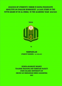 The research found that the mastery of fifth grade of MI Al-Huda, Samarinda – Kalimantan Timur in using possessive adjective on English worksheet was low. The highest percentage is error of ordering with percentage 42,5%, the second is error of formation with percentage 55%, next is error of omission its percentage 1,25%, the last, the percentage error of addition its 1,25%. These are three factors caused of students’ error. First factor is influenced by mother tongue, the second factor is because the students still confused in translated Indonesian text to English text, the last factor is because the teacher not uses appropriate method in learning process.