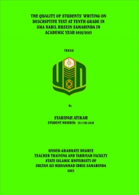 XMLSyaripah Atikah. 2023. The Quality of Students’ Writing on Descriptive Text at Tenth Grade in SMA Nabil Husein Samarinda. Thesis, English Education Department, Teacher Training and Education Faculty, State Islamic University of Sultan Aji Muhammad Idris Samarinda. This research under direction of Rostanti Toba, M.Pd as the first advisor and Anis Komariah, M.Pd as the second advisor.