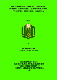 XMLMILA KUSUMAWATI, 2023. “The Effectiveness Of Quizizz To Improve Student’s Reading Skills At The Tenth Grade Student’s Of SMK Negeri 8 Samarinda”. Thesis, English Education Department, Teacher Training and Tarbiyah Faculty, State Islamic University Sultan Aji Muhammad Idris Samarinda. This research was supervised by Mr. Dr. Umar Fauzan, M.Pd as the first advisor and Mrs. Dini Irawati, M.Pd as the second advisor.
