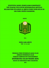 XMLNidya Lara Adysti, 2023. “Efektivitas Model Pembelajaran Kooperatif Tipe Talking Stick Untuk Meningkatkan Motivasi Belajar Pada Mata Pelajaran Al-Qur’an Hadis Siswa Kelas XII SMA Nabil Husein Samarinda”. Skripsi. Jurusan Pendidikan Islam. Fakultas Tarbiyah dan Ilmu Keguruan (FTIK). Universitas Islam Negeri Sultan Aji Muhammad Idris (UINSI) Samarinda”. Penelitian ini dibimbing oleh Prof. Dr. Zurqoni, M.Ag selaku pembimbing I dan Rumainur, M.Pd.I selaku pembimbing II. Penelitian ini didasari keadaan dalam pembelajaran siswa kelas XII di SMA Nabil Husein Samarinda yang terkadang bersikap kurang aktif, dalam suatu pembelajaran tidak sedikit siswa yang takut berbicara menyampaikan pendapat di hadapan teman kelasnya. Oleh sebab itu supaya dapat mengoptimalkan pembelajaran perlunya model pembelajaran yang mampu mendorong motivasi siswa serta melibatkan siswa supaya aktif dan giat di dalam pembelajaran. Tujuan penelitian ini adalah untuk mengetahui efektivitas model pembelajaran kooperatif tipe talking stick terhadap motivasi belajar siswa pada mata pelajaran al-quran hadis siswa kelas XII SMA Nabil Husein Samarinda. Penelitian ini menerapkan metode quasi eksperimen dan desain penelitiannya yaitu non-equivalent control group design. Dimana XII MIPA 3 sebagai kelas control dan XII MIPA 2 kelas eksperimen, dengan jumlah siswa yaitu 34 siswa kelas XII MIPA 3 dan 33 siswa kelas XII MIPA 2. Kemudian dilakukan uji instrumen terlebih dulu di Kelas XII MIPA 1 untuk menguji validitas butir angket. Dengan hasil uji instrumen tersebut didapat 10 butir angket model pembelajaran kooperatif tipe talking stick dan 11 butir angket motivasi belajar yang valid serta reliabel. Sementara itu, teknik pengkajian data yang diterapkan pada penelitian ini yaitu uji normalitas, uji homogenitas, dan uji hipotesis. Pengujian data menggunakan IBM SPSS versi 29. Dari penelitian hasil yang didapatkan dari pelaksanaan model pembelajaran tongkat berbicara atau talking stick ialah cukup efektif pada motivasi belajar siswa kelas XII SMA Nabil Husein Samarinda. Hal ini tersebut didukung oleh hasil n-gain yaitu rata-rata kelas kontrol 30.30% sedangkan kelas eksperimen 57.13% dan hasil uji dari paired sample t-test dimana diperoleh nilai pair 1 Sig. (2-tailed) 0,001 < 0,05 dan pada pair 2 sig. (2-tailed) 0,001 < 0,05 jadi dapat disimpulkan bahwasanya ????0 ditolak ???????? diterima. Hal ini menunjukkan adanya perbedaan dan menunjukkan bahwa model pembelajaran kooperatif tipe talking stick cukup efektif dalam meningkatkan motivasi belajar pada mata pelajaran al-qur’an hadis siswa kelas XII SMA Nabil Husein Samarinda.