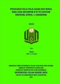 XMLWiwin, 2022. “ Penanaman Nilai-Nilai Agama dan Moral pada anak Kelompok B di TK Aisyiyah Bustanul Athfal 14 Samarinda, Skripsi, Program Studi Pendidikan Islam Anak Usia Dini (PIAUD), Jurusan Pendidikan Madrasah Fakultas Tarbiyah dan Ilmu Keguruan Universitas Islam Negeri Sultan Muhammad Idris Samarinda (UINSI) Samarinda”. Penelitian ini dibimbing oleh Ibu Dr. Hj. Robingatin, M. Ag selaku pembimbing I dan Bapak Wildan Saugi, M. Pd selaku pembimbing II.
