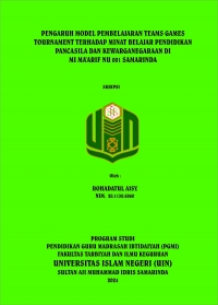 XMLRohadatul Aisy, 2024. “Pengaruh Model Pembelajaran Teams Games Tournament Terhadap Minat Belajar Pendidikan Pancasila dan Kewarganegaraan Di MI Ma’arif NU 001 Samarinda”. Skripsi, Program Studi Pendidikan Guru Madrasah Ibtidaiyah, Jurusan Pendidikan Madrasah, Fakultas Tarbiyah dan Ilmu Keguruan, Universitas Islam Negeri Sultan Aji Muhammad Idris Samarinda. Penelitian ini dibimbing oleh Marniati Kadir, M.Pd selaku dosen pembimbing I dan Ahmad Maulana Syafi’i, M.Si selaku dosen pembimbing II. Penelitian ini dilatar belakangi oleh minat belajar siswa yang rendah pada mata pelajaran Pendidikan Pancasila dan Kewarganegaraan, dengan permasalahan yang ada upaya yang dilakukan oleh guru ialah mengimplementasikan model pembelajaran teams games tournament, karena model pembelajaran ini tidak memiliki banyak persiapan alat dan bahan, tidak memerlukan fasilitas khusus, akan tetapi sesuai dengan konsep belajar yang sejalan dengan penghayatan mata pelajaran Pendidikan Pancasila dan Kewarganegaraan. Penelitian ini bertujuan untuk mengetahui penerapan model pembelajaran teams games tournament, minat belajar siswa pada mata pelajaran Pendidikan Pancasila dan Kewarganegaraan, serta untuk mengetahui ada atau tidaknya pengaruh model pembelajaran teams games tournament terhadap minat belajar Pendidikan Pancasila dan Kewarganegaraan kelas III MI Ma’arif NU 001 Samarinda. Penelitian ini merupakan penelitian kuantitatif dengan jenis penelitian ex-post facto. Poulasi dalam penelitian berjumlah 100 siswa dan sampel penelitian berjumlah 25 siswa. Teknik pengumpulan data yang digunakan dalam penelitian yaitu angket, dokumentasi, dan observasi. Adapun teknik analisis data dalam penelitian ini menggunakan uji validitas, uji reliabilitas, uji normalitas, uji linearitas, uji t, dan uji koefisien determinasi. Hasil dari penelitian diperoleh bahwa penerapan model pembelajaran teams games tournament diperoleh kesimpulan berkategori sangat sesuai dengan langkah-langkah pembelajaran, serta minat belajar Pendidikan Pancasila dan Kewarganegaraan diperoleh kesimpulan berkategori sangat tinggi. Berdasarkan hasil uji t dengan nilai thitung 2,935 > ttabel 1,713, yang artinya diterima dengan hipotesis terdapat pengaruh model pembelajaran teams games tournament terhadap minat belajar Pendidikan Pancasila dan Kewarganegaraan kelas III MI Ma’arif NU 001 Samarinda. Berdasarkan uji koefisien determinasi memperoleh kesimpulan model pembelajaran teams games tournament berpengaruh sebesar 55,3% terhadap minat belajar Pendidikan Pancasila dan Kewarganegaraan.