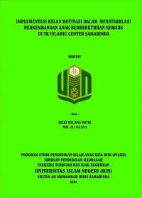 XMLRizki Yuliana Putri, 2024. Implementasi Kelas Motivasi dalam Menstimulasi Perkembangan Anak Berkebutuhan Khusus di TK Islamic Center Samarinda. Skripsi, Program Studi Pendidikan Islam Anak Usia Dini, Jurusan Pendidikan Madrasah, Fakultas Tarbiyah dan Ilmu Keguruan, Universitas Islam Negeri Sultan Aji Muhammad Idris Samarinda. Penelitian ini dibimbing oleh ibu Mujahidah, S.Ag., S.Psi., M.Si., CH., C.Med. selaku pembimbing I dan ibu Nurwati M.Pd. selaku pembimbing II. Latar belakang penelitian ini yaitu adanya progam kelas motivasi sebagai upaya untuk menstimulasi perkembangan anak berkebutuhan khusus di sekolah inklusi, yang bertujuan untuk memberikan perhatian khusus dan progam yang disesuaikan dengan anak berkebutuhan khusus. Penelitian ini bertujuan untuk mengetahui bagaimana pelaksanaan implementasi kelas motivasi dalam menstimulasi perkembangan anak berkebutuhan khusus di TK Islamic Center Samarinda. Jenis penelitian ini adalah kualitatif dengan menggunakan pendekatan studi kasus. Sumber data yang digunakan yaitu sumber data primer yang diperoleh dari empat anak berkebutuhan khusus melalui observasi dan wawancara. Data sekunder diperoleh melalui dokumentasi dan beberapa arsip di TK Islamic Center Samarinda. Teknik pengumpulan data yang digunakan yaitu observasi, wawancara dan dokumentasi. Teknik keabsahan data yang digunakan dalam penelitian ini adalah triangulasi sumber, triangulasi teknik, dan triangulasi waktu. Teknik analisis data dengan model Saldana, Miles dan Huberman yaitu kondensasi data, penyajian data, dan penarikan Kesimpulan. Penelitian di TK Islamic Center Samarinda menunjukkan bahwa implementasi kelas motivasi untuk anak berkebutuhan khusus melalui tiga tahapan yaitu perencanaan, pelaksanaan, dan penilaian yang dilakukan dengan cermat. Perencanaan melibatkan komunikasi terbuka dengan orang tua dan asesmen mendalam untuk mengembangkan Program Pembelajaran Individual (PPI) yang disesuaikan. Pelaksanaan terdiri dari kegiatan awal, inti, dan akhir, termasuk penggunaan alat peraga dan aktivitas yang mendukung perkembangan motorik. Penilaian dilakukan secara berkala oleh guru shadow, guru kelas reguler, dan guru kelas inklusi dengan umpan balik rutin kepada orang tua. Hambatan yang dihadapi meliputi tantangan komunikasi dengan ABK dan keterbatasan ruang untuk anak yang tantrum, yang sering mengganggu pembelajaran. Solusi yang diterapkan meliputi penyediaan ruang khusus untuk anak yang membutuhkan waktu menenangkan diri dan penerapan strategi pengajaran yang adaptif agar anak berkebutuhan khusus lebih memahami pada saat pembelajaran berlangsung, strategi pada saat berkomunikasi dengan anak berkebutuhan khusus, memastikan lingkungan belajar yang lebih inklusif dan efektif.