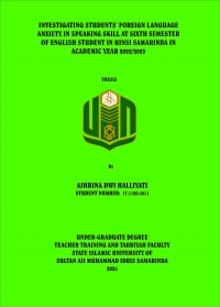 Halliyati, Ajhrina Dwi. 2024. “Investigating Students’ Foreign Language Anxiety in Speaking Skill at Sixth Semester of English Student in UINSI Samarinda in Academic Year 2022/2023”. Undergraduate thesis. English Education Department, Teacher Training and Education Faculty, State Islamic University Sultan Aji Muhammad Idris Samarinda. This research in under the guidance of Mr. Umar Fauzan, M. Pd as the first advisor, and Dra. Sitti Hadijah, M. Pd as the second advisor. Speaking is one of most complicated skill among four English skills. English learners are exceedingly needed to master speaking skill. Although speaking skill is exceedingly important, English learners always found problems during mastering speaking skill. One of the biggest problems is the anxiety in speaking skill. The research objectives of this research are to know the factors of anxiety in speaking skill and to know the solutions of anxiety in speaking skill. This research used the descriptive quantitative research. The instrument of this research was the questionnaire. The kind of questionnaire that used in this research was close-ended question that consist of 60 questions related to the factors and solutions of anxiety in speaking skill. The questions of the questionnaire consisted of Yes and No answer. The data of this research was calculated by frequency calculation. The population of this research was the sixth semester students of English Department in UINSI Samarinda in academic year 2022/2023. The researcher finds and selects 10 factors of anxiety and 5 solutions of anxiety in speaking skill. The first finding is the factors of anxiety in speaking skill. The factors are the incomprehensible input, students’ belief about anxiety, lack of preparation, afraid to make mistake, unconfident to speak English, anxiety when teacher asked to speak up, speaking in front of class, study environment, teacher personality, and unfavorable evaluation. There is another finding which is the solutions of anxiety in speaking skill. The solutions are preparation, relaxation, mindset management, more willing to take risks, and improve speaking skill. Thus, the factor of anxiety that contribute the most in speaking anxiety is lack of preparation and the solution of anxiety that the most effect to overcome the anxiety is mindset management.