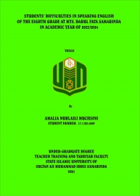 XMLAmalia Nurlaili Muchsini. 2024. “Students’ Difficulties In Speaking English Of The Eighth Grade At MTs. Darul Fata Samarinda In Academic Year 2023/2024”. Thesis, Language Education Department, English Language Study Program, Education and Teacher Training Faculty, State Islamic University Of Sultan Aji Muhammad Idris Samarinda. This research was supervised by Rostanti Toba, M.Pd, as the first advisor, and Anis Komariah, M.Pd as the second advisor. English has become a global language used in different social settings, such as workplaces or educational fields. Therefore, the Ministry of Education has decided to incorporate English as a subject to be taught in the schools to the students. However, in reality, many students struggle to master English, especially speaking, because they face difficulties. The students often stutter or stop talking when they do not know the word in English. They also lack of vocabulary mastery. These problems hinder the students from speaking English fluently. Thus, the researcher conducted a research with several purposes. The first is to discover the difficulties that the students faced in mastering the speaking skills. The second is to find out the strategies that the teacher used to help the students to overcome the difficulties. The data was collected during the in English class. The research used qualitative method. In addition, this research used Interview and observation as instruments. The data was collected through interviews with the students and teacher, and observation in the classroom during the teaching and learning process. Then, the data was analyzed using Miles and Huberman’s steps. There are data condensation, data display, and drawing conclusion/verification. Triangulation was used to validate the data. The results of the research at MTs. Darul Fata Samarinda showed that the students faced difficulties in speaking English. The problems were linguistic problems and non-linguistic problems. The linguistic problems consisted of lack of vocabulary, grammar, and pronunciation. The non-linguistic problems consisted of fear in making mistakes, shyness, anxiety, lack of confidence, and lack of motivation. Meanwhile, the strategies used by the teacher to overcome these difficulties were pairs or group discussions, and repetition and memorization strategies.