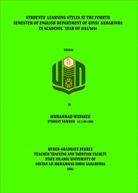 XMLMuhammad Watakee, 2024. “Students’ Learning Styles at The Fourth Semester of English Department of UINSI Samarinda Academic Year of 2023/2024”. Thesis, English Education Department, Teacher Training and Education Faculty, State Islamic University Sultan Aji Muhammad Idris Samarinda. This research is under the guidance of Mrs. Rostanti Toba, M.Pd as the first advisor and Mrs. Anis Komariah M. Pd as the second advisor. Learning style is way that a student uses to capture information or knowledge, how to remember, think, and solve problems in the learning process. Learning styles could be beneficial for the students and the teachers in learning process. If learning style of students going well with the teaching method used by teachers, the students will be very possible to succeed in learning process. The purpose of this study is to identify students’ learning styles at the fourth semester of English department of UINSI Samarinda. This research used a quantitative method. The data were collected using questionnaire. The population and sample were the fourth semester students at English Department of UINSI Samarinda, there were 30 students from TBI 1 involved in this research. In analyzing the data in this study, the researcher used a percentage and mean score technique by analyzing the questionnaires that had been filled out by the respondents. Results of the research showed that the learning styles of male and female students in the fourth semester are different. Male students prefer group learning style with a mean score of 12.09. Meanwhile, female students prefer tactile learning style with a mean score of 13.15. The most dominant learning style in learning English at the fourth semester is group learning style which is indicated by the highest mean score of 12.36.