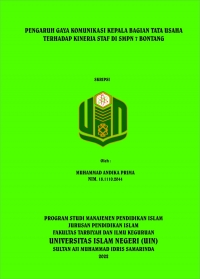 Muhammad Andika PRIMA. 2022. “Pengaruh Gaya Komunikasi Kepala Bagian Tata Usaha Terhadap Kinerja Staf Di SMPN 7 Bontang ”. Program Studi Manajemen Pendidikan Islam. Fakultas Tarbiyah dan Ilmu Keguruan Universitas Islam Negeri Sultan Aji Muhammad Idris (UINSI) Samarinda. Penulisan skripsi ini dibawah bimbingan Muhammad Iwan Abdi, M.Si selaku Pembimbing I, dan Nurwati M.Pd selaku Pembimbing II.