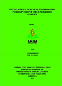 XMLTasyha Nur Ulfa, Strategi Kepala Sekolah dalam penyelenggaraan pendidikan era covid-19 di Mi Al Mujahidin Samarinda. Skripsi, Samarinda: Progam Studi Manajemen Pendidikan Islam Jurusan Pendidikan Islam IAIN Samarinda, 2021. Dibawah bimbingan Dr. Siti Julaiha,S.Ag, M.Pd sebagai pembimbing I dan Ishmatul Maula, M.Pd sebagai pembimbing II.