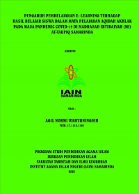 Agil Normi Wahyuningsih, (1711101190). “Pengaruh Pembelajaran E- Learning Terhadap Hasil Belajar Siswa Dalam Mata Pelajaran Aqidah Akhlak Pada Masa Pandemic Covid-19 di Madrasah Ibtidaiyah (MI) At-Taufiq Samarinda”, Skripsi, Jurusan Pendidikan Islam, Fakultas Tarbiyah dan Ilmu Keguruan. Universitas Islam Negeri Sultan Aji Muhammad Sulaiman (UINSI) Samarinda. Penelitian ini di bimbing oleh Dr. Muhammad Nasir, M.Ag selaku pembimbing I dan Dr. Surat man, M.Pd selaku pembimbing II.