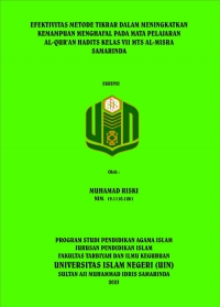 Muhamad Riski, 2023. “Efektivitas Metode Tikrar Dalam Meningkatkan Kemampuan Menghafal Pada Mata Pelajaran Al-Qur’an Hadits Kelas VII MTs Al- Misra Smarinda”. Jurusan Pendidikan Islam Fakultas Tarbiyah dan Ilmu Keguruan UIN Sultan Muhammad Idris (UINSI) Samarinda. Penelitian ini di bimbing oleh Muhammad Iwan Abdi, M.S.I sebagai pembimbing I, dan Rumainur, M.Pd.I sebagai pembimbing II.