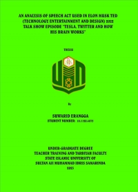 XMLSuwarid Erangga, 2023. “An analysis of speech act used in Elon musk TED (Technology Entertainment and Design) 2022 Talk Show Episode “Tesla, Twitter and How His Brain Works””. Undergraduate Degree. Thesis, English Education Department, Teacher Training and Tarbiyah Faculty, Sultan Aji Muhammad Idris State Islamic University of Samarinda. This research is under guidance of Dr. Bahrani, M.Pd and Dini Irawati, M.Pd.