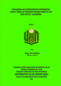 XMLRahma Dani Wahyudi, 2024 “Pengaruh Gaya Kepemimpinan Demokratis Kepala Sekolah Terhadap Kinerja Guru” Skripsi. Program Studi Manajemen Pendidikan Islam Fakultas Tarbiyah dan Ilmu Keguruan. Universitas Islam Negeri (UIN) Sultan Aji Muhammad Idris Samarinda. Penelitian ini dibimbing oleh bapak Dr. Suratman, M.Pd sebagai pembimbing I dan Ibu Dr. Yusnia Binti Kholifah, M.Pd.I sebagai pembimbing II. Kinerja guru merupakan elemen penting dalam pendidikan, selian itu jura merupakan penentu tinggi rendahnya kualitas pendidikan. Kinerja guru dilakukan oleh guru dalam melaksanakan tugas seorang pendidik. Kulitas kinerja sangat menentukan pada hasil pendidikan dikarenakan guru adalah elemen terpenting dalam pendidikan. Guru merupakan sosok yang sering berinterasi secara tidak langusng dengan siswa data proses pembelajaran. Untuk melakukan semua, guru sebagai pengajar dan siswa sebagai subjek belajar, dituntut adanya profil kualifikasi tertentu dalam pengetahuan, kemampuan sikap dan tata nilai serta sifat-sifat pribadi, agar proses itu dapat berlangsung dengan efektif dan efisien. Namun dalam pelaksanaannya pembelajaran masih diangap rumit oleh guru, kerna guru harus memahaminya dengan baik agar dalam pembelajaran terjadi interaksi belajar dengan baik. Oleh karena itu guru memerlukan mentor atau pemimpin yang dapat membantu memahami konsep pembelajaran dengan baik. Maka pentingnya gaya kepemimpinan demokratis kepala sekolah terhadap kinerja guru. Penelitian ini, penelitian menggunakan jenis penelitian kuantitatif. Populasi dalam penelitian ini adalah guru di SMA Plus Melati Samarinda yang berjumlah 20 guru sedangkan, sampel dari penelitian yang dihitung dari rumus Yamane, Isac, dan Micahel mendapatkan hasil sampel berjumlah 19 guru. Adapun bentuk pilihan skor yang digunakan dalam kuisioner yakni 4 alternatif jawaban. Metode pengumpulan data menggunakan obeservasi, angket dan dokumentasi. Untuk teknik analisis data penelitian menggunakan uji prasyarat yang didalamnya terdapat uji normalitas, uji linearitas, uji koefisien determinasi dan uji hipotesis. Hasil penelitian ini menunjukkan bahwa gaya kepemimpinan demokratis kepala sekolah berpengaruh positif terhadap kinerja guru di SMA Plus Melati Samarinda. Jika dilihat dari perhitungan linear sederhana, menunjukan bahwa angka koefisien regresi sebesar 0,413. Karena nilai koefisien regresi bernilai positif (+), maka penelitian ini memiliki pengaruh yang positif. Dan jika dilihat dari hasil nilai thitung (12,587) > ttabel (2,109) dengan signifikansi 0,000 maka terdapat pengaruh yang signifikansi antara gaya kepemimpinan demokratis kepala sekolah terhadap kinerja guru di SMA Plus Melati Samarinda. Perhitungan koefisien determinasi diperoleh angka 41,3% dan sisanya 58,7% dipengaruhi oleh faktor-faktor lainnya. Dengan demikian maka terdapat pengaruh yang positif antara gaya kepemimpinan demokratis kepala sekolah terhadap kinerja guru di SMA Plus Melati Samarinda. Gaya kepemimpinan demokartis kepala sekolah juga memberikan pengaruh dalam menghadilkan atau membentuk kinerja guru yang baik di SMA Plus Melati Samarinda