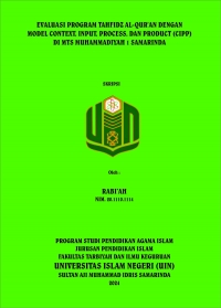 XMLRabi’ah, “Evaluasi Program Tahfidz Al-Qur’an Dengan Model Context, Input, Process, dan Product (CIPP) di MTs Muhammadiyah 1 Samarinda”. Skripsi. Program Studi Pendidikan Agama Islam (PAI), Jurusan Pendidikan Islam, Fakultas Tarbiyah dan Ilmu Keguruan (FTIK), Universitas Islam Negeri Sultan Aji Muhammad Idris (UINSI) Samarinda. Penelitian ini dibimbing oleh Bapak Dr. Khojir, M. S.I dan Ibu Dr. Yusnia Binti Kholifah, M.Pd.I MTs Muhammadiyah 1 Samarinda merupakan salah satu lembaga yang aktif melaksanakan program tahfidz Al-Qur’an. Untuk mengetahui ketercapaian dari tujuan program tahfidz, pelaksanaan evaluasi sangat dibutuhkan. Evaluasi pada riset ini mengaplikasikan model CIPP dikarenakan komponen-komponenya yang bersifat komprehensif. Adapun tujuan riset ini yakni untuk mengetahui bagaimana context, input, process, dan product (CIPP) pada program Tahfidz Al-Qur’an di MTs Muhammadiyah 1 Samarinda. Penelitian ini menggunakan pendekatan kualitatif deskriptif. Teknik pengumpulan data yang digunakan adalah wawancara mendalam, observasi partisipan, dan dokumentasi. Sumber data diperoleh dari sumber data primer dan sumber data sekunder. Teknik analisis data yang digunakan menggunakan model analisis interaktif yang meliputi, reduksi data, penyajian data, dan penarikan kesimpulan. Untuk teknik keabsahan data yang digunakan ialah triangulasi sumber dan triangulasi teknik. Hasil penelitian pada evaluasi program Tahfidz Al-Qur’an dengan model Context, Input, Process, dan Product (CIPP) di MTs Muhammadiyah 1 Samarinda yaitu pada evaluasi context, meliputi evaluasi tujuan program tahfidz dan evaluasi kebutuhan program. Evaluasi tujuan program tahfidz yang telah tercapai yakni peserta didik telah terbiasa menghafal Al-Qur’an sedangkan pada evaluasi kebutuhan program, sekolah telah memenuhi kebutuhan yang diperlukan dalam mendukung pelaksanaan program tahfidz. Kemudian pada evaluasi input meliputi evaluasi perencanaan dan strategi, evaluasi tenaga pengajar, evaluasi peserta didik, dan evaluasi metode. Pada evaluasi input, sekolah telah memiliki perancanaan dan strategi yang baik dalam pelaksanaan program, memiliki tenaga pengajar yang telah profesional, dan telah menerapkan metode dalam pelaksanaanya, adapun kemampuan menghafal peserta didik yang baik dipengaruhi oleh perhatian dari orang tua. Evaluasi process meliputi evaluasi terhadap pelaksanaan program, yang di mana pelaksanaan program tahfidz Al-Qur’an telah berlangsung dengan baik dan sesuai dengan jadwal meskipun masih terdapat beberapa kendala dalam pelaksanaanya. Selain itu pada evaluasi product meliputi evaluasi terhadap hasil dari program, 81 dari 164 peserta didik telah mampu mencapai target yang telah ditentukan dan keterampilan peserta didik setelah program tahfidz menjadi lebih baik.