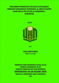 XMLAisya Nur Fahira, 2024 “Pengaruh Penggunaan Aplikasi Cinta Quran Terhadap Kemampuan Menghafal Al-Qur’an Hadits Siswa Kelas VIII di MTs Al- Mujahidin 1 Samarinda”. Skripsi Jurusan Pendidikan Islam. Program Studi Pendidikan Agama Islam. Fakultas Tarbiyah dan Ilmu Keguruan, Universitas Islam Negeri Sultan Aji Muhammad Idris Samarinda. Penelitian ini dibimbing oleh Ibu Dr. Siti Julaiha, S. Ag, M. Pd selaku Pembimbing I dan Bapak Ahmad Maulana Syafi’i, M. Si selaku Pembimbing II. Penelitian ini dilatarbelakangi oleh guru yang menggunakan Aplikasi Cinta Quran dalam pembelajaran menghafal ayat-ayat Al-Qur’an dalam Mata Pelajaran Al-Qur’an hadits yang bertujuan agar peserta didik dapat menghafal Al-Qur’an dengan mudah sesuai kaidah dalam membaca dan melafadzkan Al-Qur’an, Aplikasi ini digunakan karena terdapat masalah peserta didik yang belum mencapai hafalan dan membaca Al-Qur’an dengan baik dan benar, seperti masalah-masalah yang sering muncul selama proses pembelajaran di kelas yaitu, peserta didik kurang mampu menghafal Al-Qur’an dengan tartil, peserta didik kurang mampu dalam melafadzkan makhorijul huruf dengan baik dan benar, dan peserta didik kurang mampu dalam membaca dan menghafal sesuai kaidah hukum tajwid. Di dalam Aplikasi Cinta Quran sudah dilengkapi dengan murottal yang dapat diulang berkali- kali disertai dengan hukum tajwid, dan juga dilengkapi dengan kuis dan game yang membantu siswa dalam mengingat hafalannya, kuis dan game inilah yang membuat aplikasi ini menarik dan berbeda dari aplikasi lainnya. Maka, Aplikasi Cinta Quran digunakan oleh guru karena dapat memecahkan masalah yang sudah dijelaskan. Penelitian ini dilakukan untuk mengetahui Seberapa besar pengaruh Aplikasi Cinta Quran terhadap kemampuan menghafal Al-Qur’an Hadits siswa kelas VIII di MTs Al-Mujahidin 1 Samarinda. Jenis penelitian yang digunakan adalah penelitian kuantitatif, dengan populasi yang berjumlah 95 peserta didik dan sampel berjumlah 33 peserta didik dengan menggunakan teknik Purposive Sampling. Teknik pengumpulan data yang digunakan adalah Angket dan Dokumentasi. Teknik Uji coba instrumen menggunakan uji validitas dan uji reliabilitas. Peneliti menggunakan Teknik analisis dan uji Prasyarat yang terdiri dari uji normalitas, uji liniearitas, uji product moment, uji t (hipotesis) dan uji koefisien determinan. Berdasarkan hasil uji analisis data yang sudah peneliti lakukan maka didapatkan hasil yaitu, terdapat pengaruh yang signifikan antara penggunaan aplikasi Cinta Quran terhadap kemampuan menghafal dan menurut perhitungan uji hipotesis disimpulkan bahwa (Ha) diterima dan (Ho) ditolak. Hal ini berdasarkan perhitungan uji t sebesar -3,999 > 2,402, besarnya pengaruh penggunaan aplikasi Cinta Quran terhadap kemampuan menghafal terlihat dari hasil R square pada koefisien determinan sebesar 0,340 atau 34%, sedangkan sisanya dikarenakan oleh faktor lain yang tidak diteliti dalam penelitian ini.