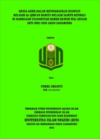XMLNurul Susanti, 2024. Upaya Guru Dalam Meningkatkan Disiplin Belajar Al-Qur’an Hadits Melalui Kartu Kendali Di Madrasah Tsanawiyah Darud Da’wah Wal Irsyad (Mts DDI) Tani Aman Samarinda. Skripsi, Program Studi Pendidikan Agama Islam, Jurusan Pendidikan Agama Islam, Fakultas Tarbiyah Dan Ilmu Keguruan, Universitas Islam Negeri Sultan Aji Muhammad Idris (UIN) Samarinda. Peneliti ini dibimbing oleh ibu Dr. Siti Julaiha, S.Ag, M.Pd dan bapak Dr. Badrut Tamam, M.Pd.I. Latar belakang dari penelitian ini adalah untuk melihat peningkatan kedisiplinan siswa, karena dengan adanya penggunaan kartu kendali yang dilakukan di sekolah Madrasah Tsanawiyah Darud Da’wah Wal Irsyad (Mts DDI) Tani Aman Samarinda sudah menjadi media pilihan sejak tiga tahun yang lalu dengan pertimbangan, penggunaan kartu kendali merupakan evaluasi yang di lakukan sebagai media pengontrol kedisiplinan siswa atau pengendali perilaku siswa serta media penghubung antara siswa, guru dan orang tua siswa. Sehingga tujuan dari penelitian ini adalah untuk mendeskripsikan tentang upaya guru dalam meningkatkan disiplin belajar di Madrasah Tsanawiyah Darud Da’wah Wal Irsyad (MTs DDI) Tani Aman Samarinda. Jenis penelitian ini merupakan penelitian kualitatif, dengan sumber data primernya adalah 1 guru Al-Quran Hadits, 1 kepala sekolah dan 15 siswa di Madrasah Tsanawiyah Darud Da’wah Wal Irsyad (Mts DDI) Tani Aman Samarinda, sedangkan sumber data sekundernya adalah profil sekolah, struktur organisasi, tata tertib sekolah, daftar nama guru dan nama siswa. Teknik pengumpulan datanya menggunakan obsevasi, wawancara dan dokumentasi. Data yang terkumpul dari teknik tersebut kemudian siperiksa keapsahan datanya dengan menggunakan triagulasi dengan uji teknik dan uji sumber. Setelah itu, data dianalisis dengan tahapan kondensasi data, penyajian data, verifikasi dan penarikan kesimpulan. Upaya guru dalam meningkatkan disiplin belajar Al-Qur’an Hadits melalui kartu kendali di Madrasah Tsanawiyah Darud Da’wah Wal Irsyad (Mts DDI) Tani Aman Samarinda menggambarkan bahwa : Upaya guru dalam meningkatkan disiplin siswa yang pertama, ketepatan waktu, kepala sekolah dan guru memberikan contoh teladan yang baik, menegur serta memberikan arahan dan bimbingan kepada siswa yang kurang disiplin, serta memberikan sanksi menghapal surah-surah pendek yang di luar dari hapalan wajib siswa apabila terdapat siswa/i yang terlambat hadir di sekolah. Kedua adalah ketepatan menggunakan atribut dan seragam sekolah, guru biasanya menerapkan penggunaan seragam sesuai dengan tata tertib tertulis. Ketiga, mendidik kedisiplinan siswa yang dilakukan oleh guru, guru membiasakan siswa untuk hadir tepat waktu pada jam 07:00 sudah di sekolah serta adanya Upaya guru adalah suatu aktifitas guru yang dilakukan dalam rangka mendidik kedisiplinan siswa melalui penggunaan kartu kendali yang diterapkan disekolah.