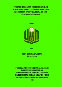XMLRyan Kusuma Wardana, 2024 ―Pengaruh Kegiatan Ekstrakurikuler Pendidikan Agama Islam Terhadap Kecerdasan Spiritual Siswa SMP Negeri 22 Samarinda‖ Skripsi, Jurusan Pendidikan Islam Fakultas Tarbiyah dan Ilmu keguruan Universitas Islam Negeri (UIN) Sultan Aji Muhammad Idris Samarinda. Penelitian ini dibimbing oleh Dr. Hj. Fathul Janah, M.S.I dan H. Susanto. Lc., M.Pd.I. Penelitian ini dilatar belakangi oleh dilaksanakannya kegiatan ekstrakurikuler pendidikan agama Islam yaitu ekstrakurikuler Baca Tulis Qur’an, Tahfidz, Habsy sebagai wadah penanaman kecerdasan spiritual siswa namun hanya sedikit siswa yang mau mengikuti kegiatan ini. Hal ini lah yang menjadi permasalahan dalam penelitian ini. Permasalahan ini dikarenakan waktu kegiatan dilaksanakan setelah jam sekolah berakhir sehingga siswa lebih memilih pulang. Oleh karenanya, peneliti tertarik untuk mengkaji tentang pengaruh kegiatan ekstrakurikuler pendidikan agama Islam (PAI) terhadap kecerdasan spiritual siswa. Tujuan penelitian ini adalah untuk mengetahui besarnya pengaruh kegiatan ekstrakurikuler pendidikan agama Islam (PAI) terhadap kecerdasan spiritual siswa. Penelitian ini menggunakan jenis penelitian Kuantitatif. Penelitian ini dilakukan di SMP Negeri 22 Samarinda. Populasi dalam penelitian ini 125 siswa yang mengikuti kegiatan ekstrakurikuler dan sampel sebanyak 95 siswa . Teknik pengumpulan data yang digunakan adalah observasi, angket, dan dokumentasi. Adapun teknik analisis yang dilakukan yaitu uji normalitas dan uji linearitas sebagai uji prasyarat, dilanjutkan pengujian hipotesis menggunakan uji Regresi Linier Sederhana. Hasil dari penelitian ini ditunjukkan dalam uji hipotesis yang dilakukan, dalam uji tersebut diperoleh nilai signifikansi sebesar 0,000 lebih kecil dari nilai signifikansi yang ditentukan yaitu 0,05. Maka disimpulkan bahwa terdapat pengaruh antara pengaruh kegiatan ekstrakurikuler pendidikan agama Islam (PAI) terhadap kecerdasan spiritual siswa. Nilai uji t yang dihasilkan thitung 3,810 > t tabel1,665 , berdasarkan hasil analisis tersebut Ha diterima. Nilai uji determinasi interpretasi r yaitu 0,367 masuk dalam kategori lemah atau rendah yaitu berada pada kisaran antara 0,20-0,399. Disimpulkan bahwa besar pengaruh kegiatan ekstrakurikuler pendidikan agama Islam (PAI) terhadap kecerdasan spiritual siswa sebesar 36,7%. Dan 63,3% dipengaruhi oleh variabel lain. Dan Ha diterima, terdapat pengaruh dengan nilai tidak signifikan.