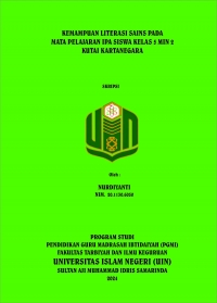 XMLNURDIYANTI, 2024. Kemampuan Literasi Sains Pada Mata Pelajaran IPA siswa Kelas 5 MIN 2 Kutai Kartanegara. Skripsi, Pendidikan Guru Madrasah Ibtidaiyah, Universitas Islam Negeri Sultan Aji Muhammad Idris Samarinda. Penelitian ini dibimbing oleh Bapak Wildan Saugi, M.Pd selaku pembimbing I dan Ibu Nurhikmah, M.Si selaku pembimbing II. Latar belakang penelitian ini di mulai dari permasalahan yang dapat dilihat dari Assesmen Kompetensi Madrasah Indonesia (AKMI) di Madrasah Ibtidaiyah Negeri (MIN) 2 Kutai Kartanegara pertama kali dilaksanakan pada tahun 2021 bulan Oktober sampai 2023 sudah membuahkan hasil dengan melihat hasil nilai rapor dari tahun pertama terus meningkat setiap tahunnya sampai pada tahun 2023 mencapai CK 3 sesuai yang diharapkan pihak sekolah. Ini berarti pelaksanaan AKMI terutama pada literasi sains sangat efektif, walaupun terkendala pada sarana dan prasana pihak sekolah tetap berupaya agar bisa terlaksananya AKMI dalam membentuk pola pikir, perilaku, serta membangun karakter siswa. Dalam menunjang pelaksanaan AKMI, guru juga telah menerapkan keterampilan literasi sains pada proses pembelajaran berupa silabus/modul di mata pelajaran IPAS, Bahasa Indonesia, dan lain sebagainya. Penelitian ini merupakan jenis kualitatif dengan pendekatan deskriptif. Pengumpulan data-data diperoleh dari observasi, wawancara secara mendalam, dan dokumentasi. Informan penelitian ini adalah Kepala sekolah MIN 2 Kutai Kartanegara, beberapa wali kelas 5 dan siswanya. Adapun uji keabsahan data melalui triangulasi tekhnik, triangulasi sumber dan triangulasi waktu. Analisis data menggunakan langkah-langkah kondensasi data, penyajian data dan penarikan kesimpulan. Hasil dari penerapan literasi sains di MIN 2 Kutai Kartanegara merupakan salah satu keberhasilan guru dalam menerapkan literasi sains pada proses pembelajaran. Kemampuan peserta didik sampai ke tahap CK 3 dan mencapai tingkat cakap serta terampil pada hasil rapor pelaksanaan AKMI merupakan keberhasilan dari kepala sekolah, waka kurikulum, staf TU, beserta guru yang sudah mampu mendukung penuh dari penerapan literasi sains walaupun dengan sarana dan prasarana terbatas. Oleh karena itu, MIN 2 Kutai Kartanegara diharapkan bisa menjadi referensi bahan perbaikan layanan pendidikan maupun dalam menyusun suatu rancangan pembelajaran untuk sekolah lain.