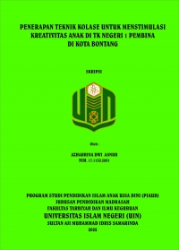 XMLAzharrina Dwi Asnur, 2021, “Penerapan Teknik Kolase untuk Menstimulasi Kreativitas Anak Di TK Negeri 1 Pembina di Kota Bontang”. Skripsi, Program Studi Pendidikan Islam Anak Usia Dini, Jurusan Pendidikan Madrasah, Fakultas Tarbiyah dan Ilmu Keguruan, Universitas Islam Negeri Sultan Aji Muhammad Idris Samarinda. Penelitian ini dibimbing oleh Dr. Hj. Robingatin, M. Ag dan Dr.Lina Revilla Malik, M.Si