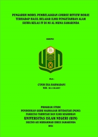 Cyndi Eka Rahmadani, 2011306037 “Pengaruh Model Pembelajaran Course Review Horay Terhadap Hasil Belajar Ilmu Pengetahuan Alam Kelas IV Di MI Al Muna Samarinda”. Skripsi, Program Studi Pendidikan Guru Madrasah Ibtidaiyah, Jurusan Pendidikan Madrasah, Fakultas Tarbiyah dan Ilmu Keguruan, Universitas Islam Negeri Sultan Aji Muhammad Idris Samarinda. Penelitian ini dibimbing oleh ibu Marniati Kadir, M.Pd selaku dosen pembimbinga I dan ibu Siti Nasiah, M.Pd selaku dosen pembimbing II. Penelitian yang bertujuan untuk menguji pengaruh dari penggunaan model pembelajaran Course Review Horay pada hasil belajar Ilmu Pengetahuan Alam ini dilatar belakangi oleh suatu permasalahan yaitu masih terdapatnya peserta didik yang memiliki hasil belajar Ilmu Pengetahuan Alam yang belum tuntas atau tidak memenuhi kriteria ketuntasan (KKM). Salah satu penyebab ialah proses pembelajaran terpusat kepada guru dan sering menggunakan pembelajaran konvensional. Sehingga perlu adanya pembelajaran yang inovatif salah satunya penggunaan model pembelajaran Course Review Horay yang dirasa perlu diterapkan dalam proses pembelajaran agar dapat memperbaiki proses pembelajaran dan membuat materi lebih mudah dipahami. Model pembelajaran Course Review Horay ini berguna untuk menambah pengetahuan dan tanpa disadari dengan adanya hasil belajar dapat membuat siswa semangat dan meningkat. Tujuan dari penelitian ini adalah untuk mengetahui pengerauh model pembelajaran course review horay terhadap hasil belajar ilmu pengetahuan alam siswa kelas IV di MI Al Muna Samarinda. Penelitian ini merupakan penelitian kuantitatif dengan menggunakan desain Quasi Ekperimental dengan jenis pretest-postest control group design. Sampel penelitian berjumlah 60 siswa yang terdiri dari 30 siswa kelas IV B sebagai kelas kontrol dan 30 siswa kelas IV A sebagai kelas eksperimen. Teknik pengumpulan dalam penelitian ini yaitu menggunakan pretest-posttest pada pilihan ganda, dokumentasi, dan tes. Adapun teknik analisis data menggunakan uji normalitas, uji homogenitas, dan uji hipotesis dengan uji independent sampel t-test menggunakan bantuan program SPSS. Perhitungan uji independent sampel t-test mendapatkan bahwa pada nilai sig. (2-tailed) ialah 0,001 < 0,05. Nilai thitung > ttabel sebesar 1.968 > 1.673. Sehingga Ha diterima HO ditolak. Jadi dapat diambil kesimpulan bahwa terdapat perbedaan yang signifikasi antara hasil belajar siswa di kelas kontrol dan kelas eksperimen. Pembelajaran menggunakan model pembelajaran course review horay mengalami peningkatan hasil belajar yang signifikan. Hal ini terlihat dari total skor pretest sebesar 1.714 dan mean/rata-rata sebesar 57,13. Sedangkan pada posttest, total skor menjadi 1.838 dan mean/rata-rata sebesar 61,26. Total skor mengalami kenaikan sebanyak 124 point dan mean/rata-rata mengalami kenaikan sebesar 4,13.