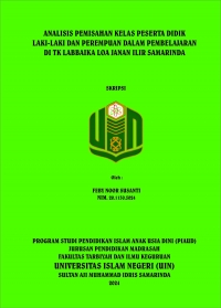 XMLFeby Noor Susanti, 2024.``Analisis Pemisahan Kelas Peserta Didik Laki-Laki dan Perempuan dalam Pembelajaran di TK Labbaika Loa Janan Ilir Samarinda``. Skripsi Program Studi Pendidikan Islam Anak Usia Dini, Jurusan Pendidikan Madrasah, Fakultas Tarbiyah dan Ilmu Keguruan Universitas Islam Negeri Sultan Aji Muhammad Idris Samarinda. Penelitian ini dibimbing oleh Ibu Dr. Hj. Robingatin, M.Ag dan Ibu Amalia Nur Aini M.Pd. Latar belakang dari penelitian ini berdasarkan kegiatan pemisahan kelas yang dilaksanakan antara peserta didik laki-laki dan perempuan. Sebagai seorang guru harus banyak memiliki pengetahuan dan pengalaman yang cukup tentang pemisahan kelas laki-laki dan perempuan karena pada pemisahan kelas ini jauh lebih mudah dikontrol dan dapat lebih maksimal pembelajarannya di dalam kelas karena sesuai dengan jenis kelaminnya. Pemisahan kelas sudah diterapkan sejak tahun 2002 di TK Labbaika Loa Janan Ilir Samarinda. Tujuan penelitian untuk mendeskripsikan analisis pemisahan kelas peserta didik laki-laki dan perempuan dalam pembelajaran di TK Labbaika Loa Janan Ilir Samarinda. Metode yang digunakan dalam penelitian ini adalah pendekatan deskriptif kualitatif. Lokasi penelitian ini di TK Labbaika Loa Janan Ilir Samarinda. Teknik pengumpulan data yang digunakan adalah teknik wawancara, observasi dan dokumentasi. Penelitian ini menggunakan sumber data yaitu pengelola yayasan, kepala sekolah, guru serta dokumentasi sekolah. Teknik analisis data yang digunakan adalah pengumpulan data, reduksi data,sajian data dan penarikan kesimpulan. Teknik keabsahan data yang digunakan adalah tringulasi sumber dan tringulasi metode. Hasil analisis pemisahan kelas peserta didik laki-laki dan perempuan dalam pembelajaran yang ditemukan peneliti Pertama, Pemisahan kelas terbagi menjadi 4 kelas terdiri dari kelas Al-Hakim, An-Nur, Al-Furqon dan Al-Huda. Kedua, tujuan dari pemisahan kelas adalah agar dapat mengenal antara laki-laki dan perempuan dan anak lebih fokus dalam pembelajaran. Ketiga, dasar pemisahan kelas untuk mengelompokkan anak berdasarkan jenis kelamin. Keempat, interaksi pemisahan kelas dimana peneliti melihat bahwa anak laki-laki dan perempuan sangat jarang untuk berinteraksi saat bermain. Kelima, pembelajaran yang dilakukan pada senin-kamis yakni pembelajaran inti dan pada hari jum`at dilakukan seperti menggambar dan pada hari sabtu itu melipat, Keeenam, karakteristik pembelajaran pemisahan kelas saat diberikan lego anak laki-laki membuat tembak-tembakan dan anak perempuan membuat rumah-rumahan. Ketujuh, prinsip-prinsip pembelajaran pemisahan kelas bahwa anak perempuan ketika diberikan tugas oleh guru lebih rapi dibandingkan dengan anak laki-laki. Kedelapan, strategi pembelajaran yang dilakukan guru yakni suaranya lebih lantang saat mengajar anak laki-laki dibandingkan mengajar anak perempuan.