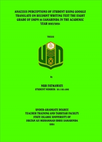 XMLFatmawati, Nur, 2024. Analysis Perceptions Of Student Using Google Translate On Recount Writing Text The Eight Grade Of SMPN 22 Samarinda In The Academic Year 2023/2024. Mrs. Dina Destari S.S.M.pd as the first supervisor. Mr. Muhammad Azwar Azmi Paramma, M. Pd as the second supervisor. Currently, the utilization of media and instruments as facilities for the acquisition of the English language has progressed, particularly with the advent of technology, which aids in the enhancement and augmentation of the experience of learning English. Various tools for online learning, including Google Translate, enable the provision of assistance to students in the translation of languages from all corners of the world. The research objective is to find how the use of Google Translate in improving students' writing in recount text and find the students perception on google translate to improve their writing skills. The research employed descriptive qualitative research. The instrument it conducted observation, interviews and documentation. The research subject was eight-grade students which conducted two of classes from 8H and 8I class. The study involved 13 students at SMPN 22 Samarinda in Academic year 2023/2024 as participant, it aims the writing of recount text found 4 problems from capitalization, spelling, punctuation and writing structure. The role of google translate provides assistance to students on how to improve and help students in writing. Then the next finding is how the use of Google Translate has received a positive response so that students feel that its use, although it has shortcomings, will still be used according to the students' own needs. Because for students, the use google translate is considered based on the frequency of students using Google Translate, either often or sometimes. ,conditional or none. This is what creates several perceptions from students themselves regarding the use of Google Translate.