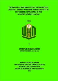 XMLSyarifah Anjelina Putri, 2024. “The Impact of Wordwall Media on Vocabulary Mastery: A Study on Eighth Grade Student at SMP Negeri 15 Samarinda in the Academic Year of 2024/2025”. Thesis, English Education Department. Teacher Training and Tarbiyah Faculty, State Islamic University of Sultan Aji Muhammad Idris (UINSI) Samarinda. Supervisor by Mrs. Dina Destari, S.S., M.Pd as a first supervisor, and Mr. Muhammad Azwar A. Paramma, M.Pd as a second supervisor. Vocabulary learning is critical in English language teaching because vocabulary directly influences skills such as listening, speaking, reading, and writing. However, due to the limited vocabulary, students have difficulties understanding reading, understanding the meaning of spoken language, compiling texts into English, or communicating in English. By choosing appropriate and efficient learning media, teachers can achieve educational goals more effectively. This research aims to determine the impact of Wordwall media on vocabulary mastery in eighth-grade students at SMP Negeri 15 Samarinda. This research used quasi-experimental research with a quantitative method with a research design of a Nonequivalent control group design. In sampling, the researcher used a cluster sampling technique with a total sample of this research is 70 students, which are 35 students as the experimental class and 35 class as the control class. Data collection was carried out by distributing pre-tests and post-tests which consisted of 25 multiple choice stuff for each test. This research used validity and reliability tests to test the validity of the data. In analyzing the data, the researcher used t-test (independent sample t-test). Based on the results, it showed an increase in students learning outcomes after learning using Wordwall with students learning outcomes based on the average post-test for the experimental class of 78,74 and the control class of 70,40. As for the results of the independent sample t-test there is a Sig (2-tailed) of 0,003 this Sig (2-tailed) value < 0,05. It showed that there is a significant difference between the experimental class and the control class. It can be concluded that there is an impact of Wordwall media on vocabulary mastery in the eighth-grade students at SMP Negeri 15 Samarinda in the academic year of 2024/2025.