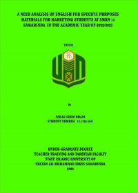XMLDhani, Sekar Arum. 2022. A Need Analysis of English for Specific Purposes Materials for Marketing Students at SMKN 14 Samarinda in the Academic Year 2022/2023. Thesis. Teacher and Training Tarbiyah Faculty. English Education Department. State Islamic University of Sultan Aji Muhammad Idris Samarinda: Advisors: Dr. Umar Fauzan, M.Pd as the first advisor and Dina Destari, S.S. M.Pd as the second advisor.