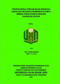 XMLRevi Najwa Agustin, 2022 “Strategi Kepala Sekolah dalam Mangelola Sarana dan Prasarana Pendidikan di SMPN 2 Murung Pudak Tanjung Tabalong Kalimantan Selatan”, skripsi ini dibimbing oleh Bapak Dr. H.M Kusasi, M.Pd selaku pembimbing I dan Ibu Hajriana, M.Pd selaku pembimbing II.