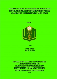 XMLIndra Irawan, 2022. “Strategi Pemimpin Pesantren dalam Menjalankan Program Kegiatan di Pondok Pesantren Tahfidz Al-Muhajirin Maridan Penajam Paser Utara”. Program studi Manajemen Pendidikan Islam fakultas Tarbiyah dan Ilmu Keguruan Universitas Islam Negeri (UIN) Sultan Aji Muhammad Idris Samarinda. Penulisan skripsi ini di bawah bimbingan ibu Dr. Hj. Ity Rukiyah, M. Pd dan bapak Muhammad Khairul Rijal, M.Pd.