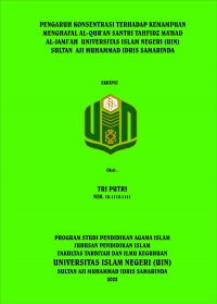 Tri Putri, 1811101141. “Pengaruh Konsentrasi Terhadap Kemampuan Menghafal Al-Qur’an Santri Tahfidz Ma’had Al-Jami’ah Universitas Islam Negeri (UIN) Sultan Aji Muhammad Idris Samarinda. Skripsi, Program Studi Pendidikan Agama Islam Fakultas Tarbiyah dan Ilmu Keguruan Universitas Islam Negeri (UIN) Sultan Aji Muhammad Idris Samarinda”. Penelitian skripsi ini dibawah bimbingan ibu Wahdatun Nisa, MA selaku Pembimbing I dan Bapak Abdul Razak, M.Pd selaku Pembimbing II.
