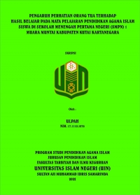 Ulpah, 2022, “Pengaruh Perhatian Orang Tua Terhadap Hasil Belajar Pada Mata Pelajaran Pendidikan Agama Islam Siswa di Sekolah Menengah Pertama Negeri (Smpn) 1 Muara Muntai Kabupaten Kutai Kartanegara” Skripsi, Program Studi Pendidikan Agama Islam (PAI), Jurusan Pendidikan Islam, Fakultas Tarbiyah dan Ilmu Keguruan (FTIK), Universitas Islam Negeri Sultan Aji Muhammad Idris (UINSI) Samarinda. Penelitian ini dibimbing oleh Bapak Dr. Suratman, M.Pd selaku dosen pembimbing I dan Ibu Rumainur, M.Pd.I selaku dosen pembimbing II.