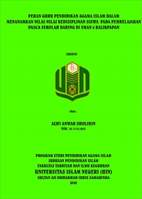 XMLAlwi Anwar Sholihin. “Peran Guru Pendidikan Agama Islam dalam Menanamkan Nilai Nilai Kedisiplinan Siswa pada Pembelajaran Pasca Sekolah Daring di SMAN 6 Balikpapan”. 2022 skripsi, Program Studi Pendidikan Agama Islam (PAI), Jurusan Pendidikan Islam Fakultas Tarbiyah dan Ilmu Keguruan (FTIK). Universitas Negeri Sultan Aji Muhammad Idris (UINSI) Samarinda. Penelitian ini dibimbing oleh bapak Iwan Abdi M.SI sebagai pembimbing I dan ibu Yunita Noor Azizah M.Pd.I sebagai pembimbing II.