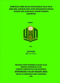 Sekolah Luar Biasa Negeri Pembina Samarinda memiliki program kegiatan keagamaan yaitu Sholat Dhuha, infaq dan mengaji di setiap hari jumat, dan juga ekstrakulikuler keagamaan berupa MTQ, Kaligrafi, dan Nasyid yang dilaksanakan seminggu sekali setelah pembelajaran usai. Terbentuknya program ini berkat kerjasama guru Sekolah Luar Biasa Negeri Pembina yang selalu mengembangkan kegiatan serta ekstrakulikuler bagi peserta didiknya agar tertanamnya Nilai-nilai Akhlak yang bisa di terapkan dalam kegiatan sehari-hari, danjuga tentunya agar mereka mampu menyesuaikan diri terhadap semua tuntutan program pendidikan yang sejalan dengan tujuan dari bimbingan. Penelitian ini dilakukan bertujuan untuk mengetahui Bimbingan guru dalam menanamkan Nilai- nilai akhlakul karimah pada anak tunagrahita ringan jenjang SMA-Luar Biasaserta mengetahui Faktor Pendukung dan Penghambat dalam pelaksanaannya.